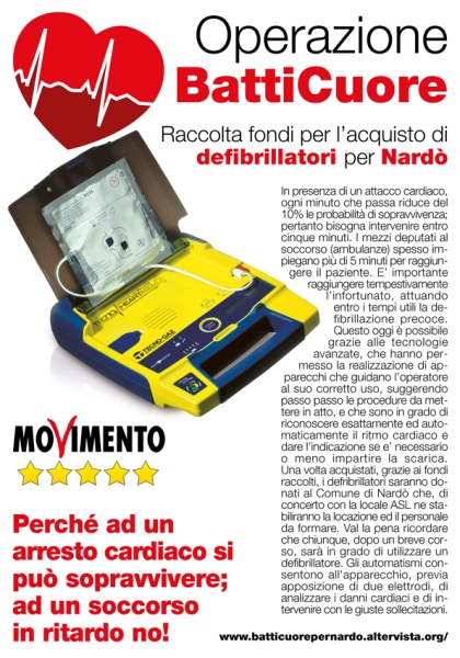 NARDO’ - Il MoVimento 5 Stelle di Nardò continua a promuovere la raccolta fondi per l'acquisto di alcuni defibrillatori da collocare sul territorio neretino. E nella giornata dell’Immacolata dalle ore 18.00 fino alle 22.00, le ragazze e i ragazzi del MoVimento organizzano un banchetto per la raccolta fondi per il progetto "Batticuore", nello spazio antistante il teatro comunale.