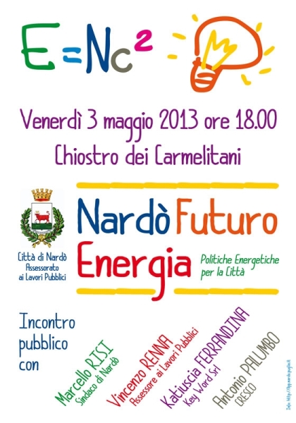 NARDO’ – Si svolgerà domani, venerdì 3 maggio, alle ore 18 presso il Chiostro dei Carmelitani, un incontro pubblico "Nardò Futuro Energia" per discutere delle politiche energetiche per la Città.