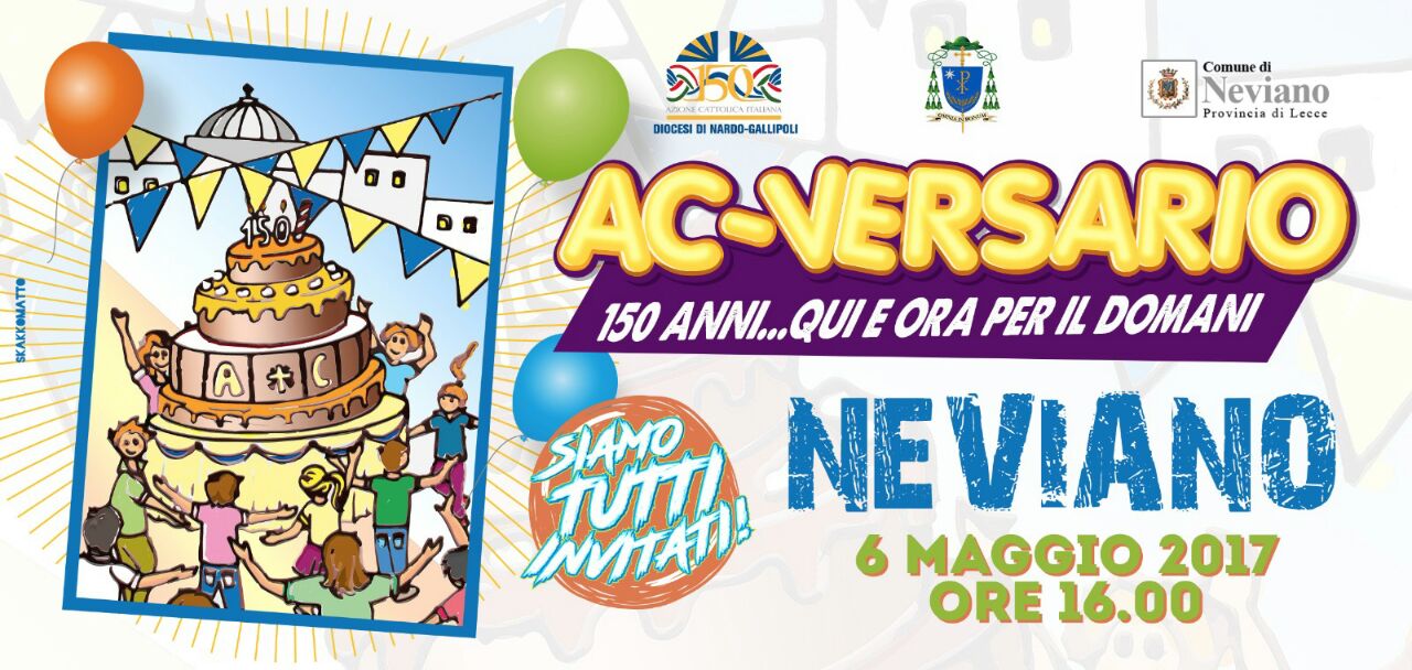 Da Roma a Neviano il passo è breve. L’Azione Cattolica di Nardò-Gallipoli, infatti, si appresta a vivere - il 6 maggio prossimo - l’“AC-versario” 150 anni… qui e ora per il domani!: una festa diocesana unitaria che si propone di “riscoprire e ripercorrere la storia dell’associazione, di rilanciarla, di rinnovare e rimotivare la vocazione associativa, testimoniando la gioia dell’adesione a una grande famiglia con libertà, corresponsabilità e gratuità, e di ringraziare il Signore, i santi e i beati della nostra Ac”, si legge sul comunicato del Consiglio Diocesano, presieduto da Andrea Bove. Guidati nella preghiera dal vescovo, S.E.R. Mons.
