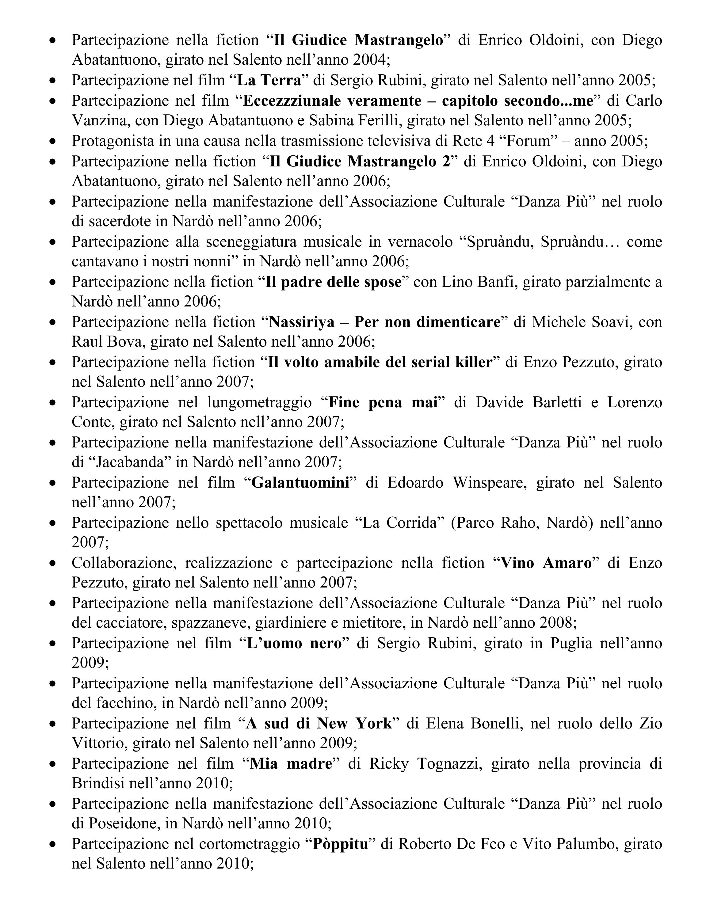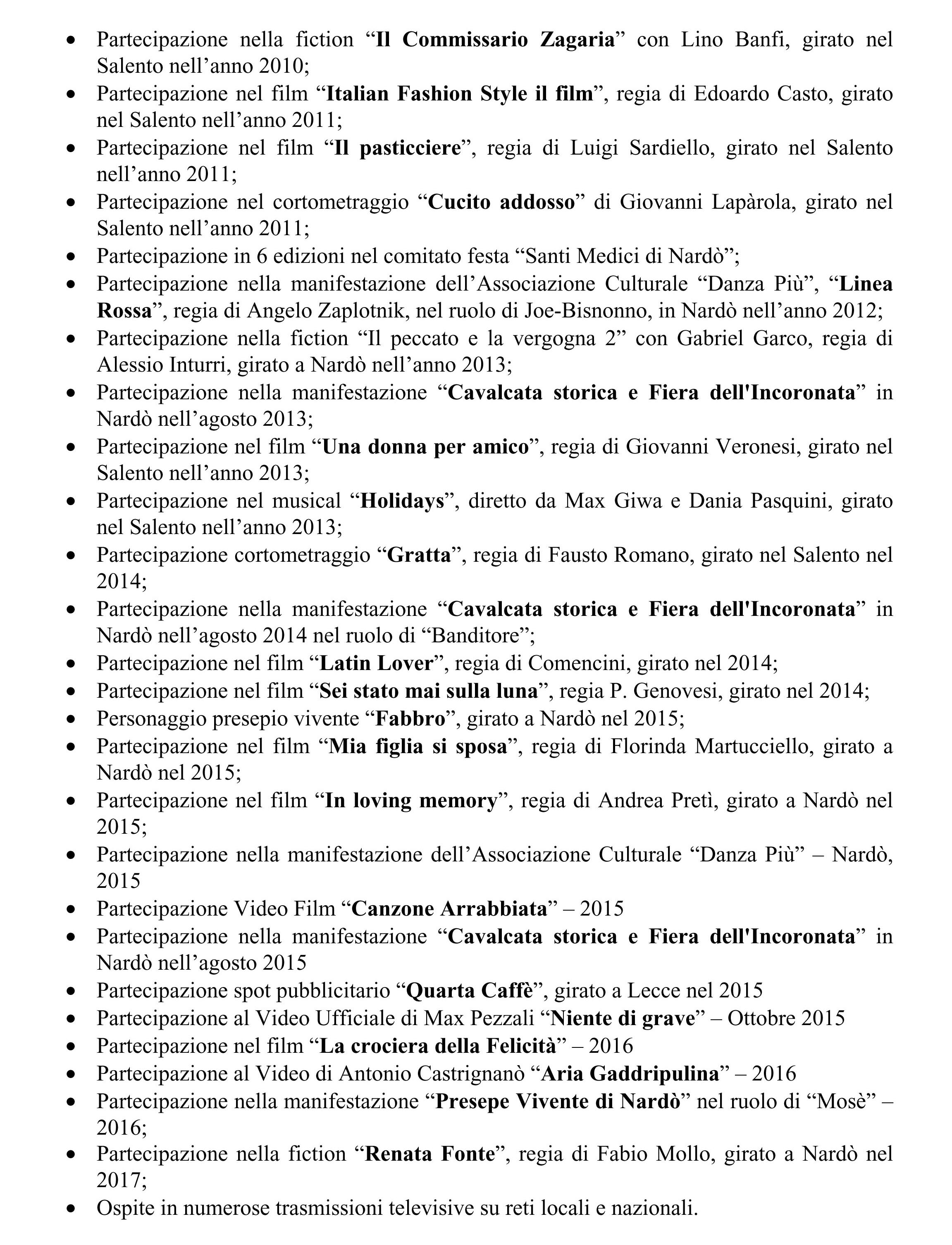 “Dopo “La Posta in gioco” uno dei film più prestigiosi è stato “L’Immagine del desiderio”, di Bigas Luna, girato a Nardò nel 1997. Fu girato con splendidi costumi d’epoca, che io ho indossato assieme alla cara amica neretina Alessandra Falangone. Furono riprese scene nel Teatro Comunale di Nardò e nelle campagne di Gallipoli. Conservo uno splendido ricordo dell’attore protagonista, Olivier Martinez, col quale feci qualche fotografia che conservo gelosamente. A seguire, conservo un ottimo ricordo del film “Guardiani delle Nuvole”, di Luciano Odorisio, ambientato nel napoletano, ma le cui riprese furono effettuate in realtà a Nardò, nella location della Masseria Brusca. In questa pellicola ho interpretato un compratore e mediatore di bestiame. Il film, che aveva un cast di primissimo piano con attori del calibro di Franco Nero, Claudia Gerini, Anna Galiena, Leo Gullotta, Alessandro Gassmann, ha vinto la Piramide d'Oro, primo premio del Festival Internazionale del Cinema del Cairo, nel 2004. Potrei citare ancora altri titoli, come “Casa eden”, di Fabio Bonzi, al quale partecipai nella scena della festa di matrimonio, girata in una Masseria di Ugento, oppure il cortometraggio “Porto di Mare” del 2003, o ancora nel film “Bar” di Davide Minnella, del 2003, dove ho interpretato il personaggio del padre dello sposo…”