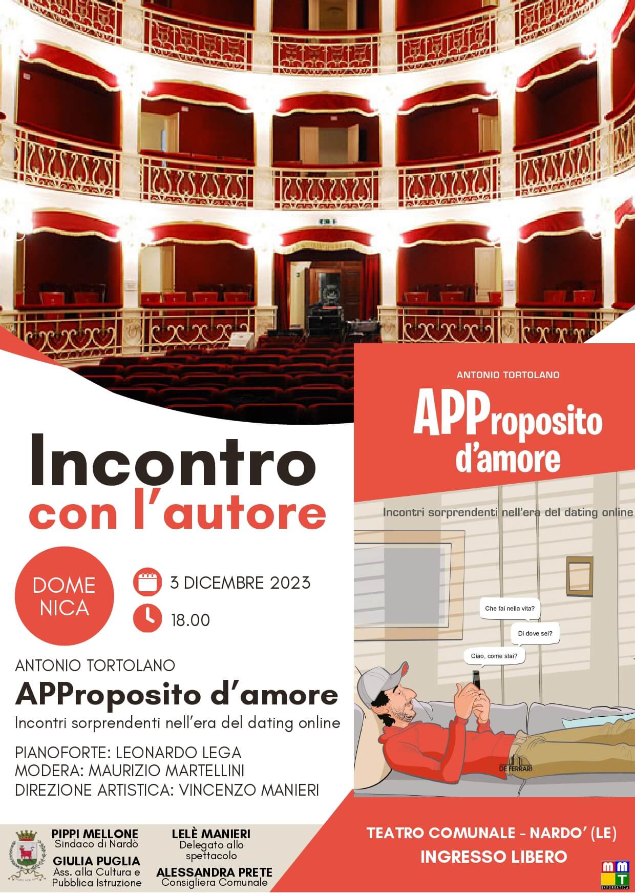 NARDO' - APProposito d’amore – Incontri sorprendenti nell’era del dating online è il romanzo che segna il debutto letterario di Antonio Tortolano. Il giornalista propone un tema caldo e attuale, molto vissuto soprattutto nelle grandi città, quello della ricerca di potenziali partner da incontrare e con cui uscire fatta attraverso i social network e i servizi dedicati. Il libro sarà presentato domenica 3 dicembre alle ore 18 al Teatro comunale (corso Vittorio Emanuele II). Maurizio Martellini modererà il colloquio con l’autore. Leonardo Lega accompagnerà le parole con le musiche del suo pianoforte. La direzione artistica della serata è di Vincenzo Manieri. L’ingresso è libero.