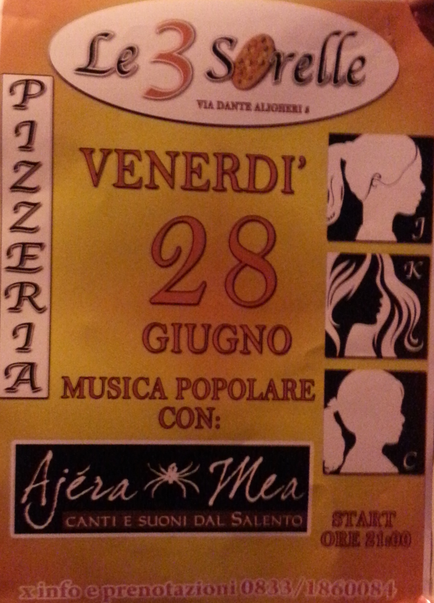 NARDO' - Appuntamento da non perdere domani 28 Giugno a "Le tre Sorelle" via Dante Alighieri a Nardo' start ore 21.00. La serata sarà allietata da "Ajèra Mea" canti e suoni del Salento.
