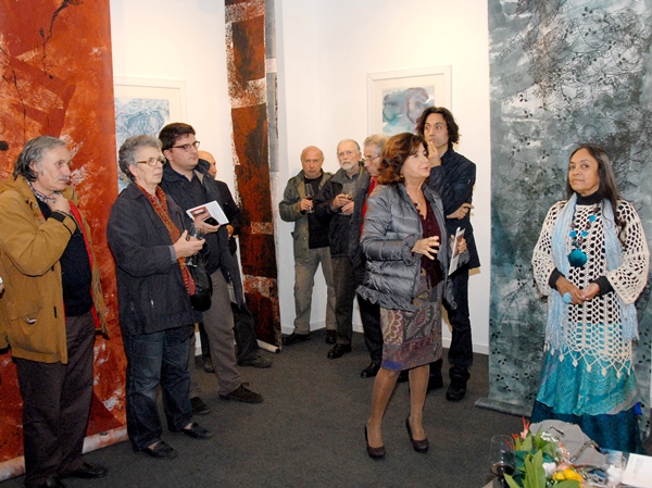 La mostra è presentata in catalogo da Marina Pizzarelli che osserva come il linguaggio della Cazalet esprime le sue sensazioni destate dal caldo abbraccio mediterraneo nella sua funzione catartica, e come l’emozionale incontro con la natura viene percepito nei suoi Sari Scrolls, lunghi rotoli di carta Hoso giapponese o di carta di riso cinese, serigrafati con immaginifiche coloratissime storie che mescolano fulgori cromatici e grovigli segnici di matrice surrealista con rimandi alla tradizione indiana.