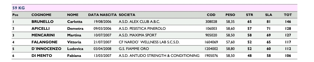 Vittoria, classe 2007, ha chiuso le sue prove nelle discipline dello "slancio" e dello "strappo" al quarto posto, un risultato di eccezionale valenza personale e formativa, considerata la categoria ed il peso sicuramente impegnativi, superata da due atlete 2006. Un risultato che premia ancora una volta il grande lavoro svolto dalla ragazza e dai sui coaches-genitori Marco Falangone e Rossella Siciliano. E che naturalmente riempe d'orgoglio l'intero box CrossFit Nardò!