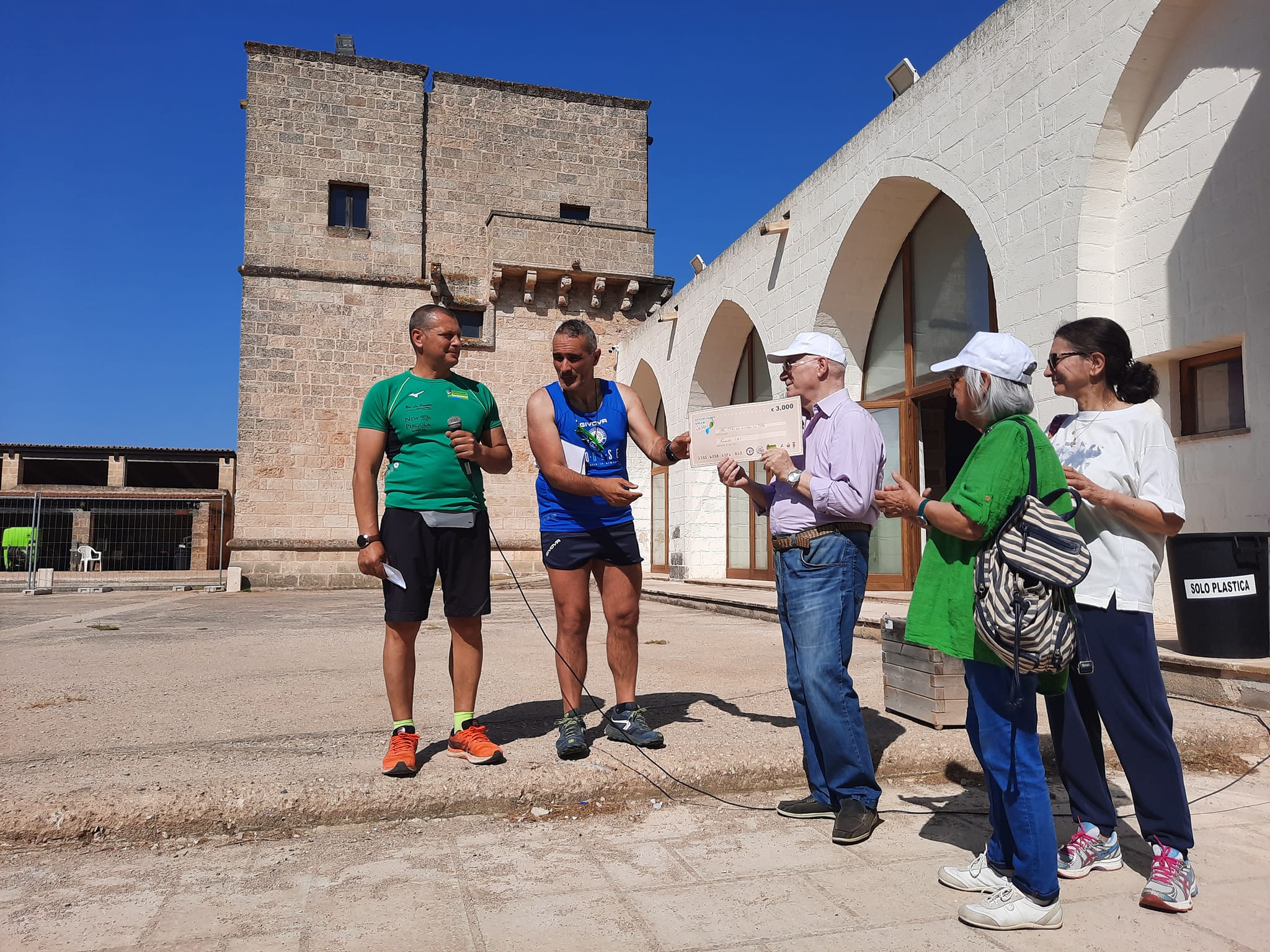 Dall'edizione 2022 della Portoselvaggio Natural Trail sono stati raccolti (al netto delle spese) e quindi interamente donati 3.000 euro. Ai quali si aggiungono un assegno di 500 euro dell'associazione di volontariato "Essere uMani" di Veglie e il ricavato del salvadanaio solidale, che non abbiamo ancora quantificato perché adoperato stamattina per raccogliere altri fondi.