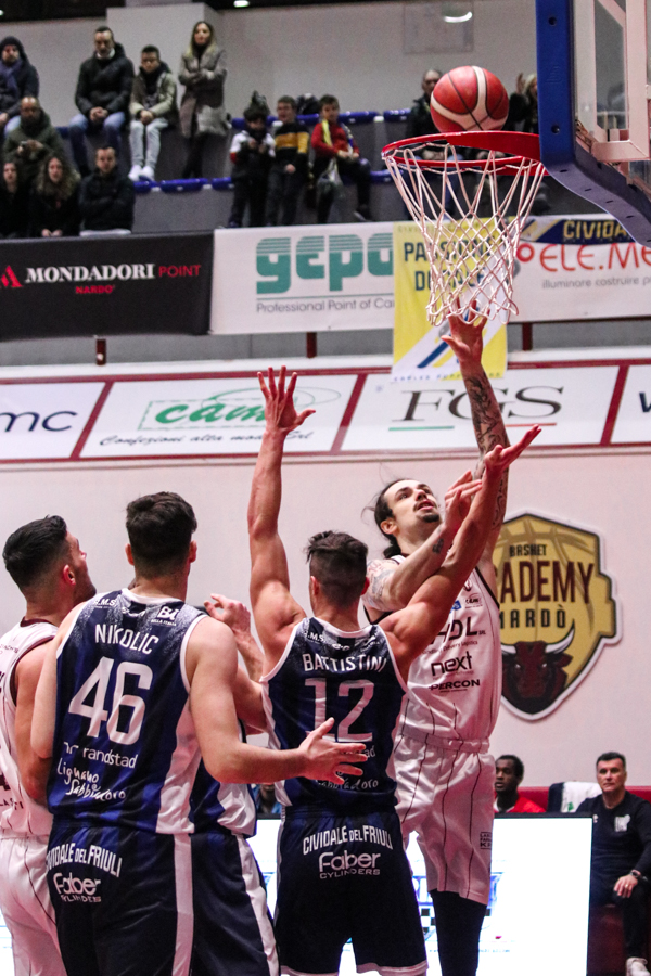 4° QUARTO – Accade l'impossibile: Smith viene espulso, Cividale sembra aver perso le staffe ed il filo del gomitolo. Nardò, sospinto dai tifosi granata, cerca di compiere il miracolo sportivo. Ciò accade, 30-12 di parziale e tempi supplementari sotto i colpi di Poletti, Stojanovic, Baldasso e compagni.
